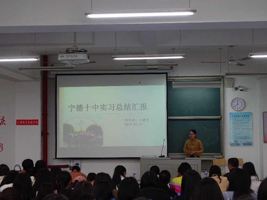 随后由15级生物科学专业的王晓青、周佳莉以及陈诗频同学代表各自实习团队汇报实习工作,期间分享了他们的实习收获。16级生科专业的于洋同学代表师范生上台发表了演讲。最后由陈爱平书记总结讲话,宣布“优秀实习生”名单并颁布奖状。