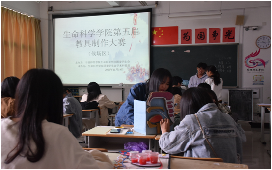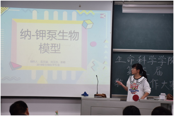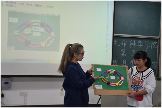 比赛中参赛选手通过实物展示以及ppt对自己制作的教具进行阐释。评委们从教学性、科学性、实用性、创新性、现场发挥五个方面进行打分。比赛中2019级生物科学班的陈欣欣和肖晓烨同学用泡沫塑料、纸片、塑料袋、胶纸等一些取材容易、易于操作、环保和可重复利用的材料制作成动物细胞的亚显微结构,生动形象展现了动物细胞的组成结构。陈顺婷、邹琳、汤淑敏三位同学利用废纸箱加上动态设计令一些小部件运动起来,生动形象的模拟食物吞咽过程。