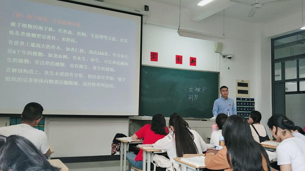 4月24日上午1-2节,刘凯良老师在CB201开设《植物生物学(二)》公开课,讲授内容为被子植物。刘老师以提问方式回顾裸子植物内容,进而导入本节课程;结合生活实例讲解被子植物主要特征,有助于学生轻松记忆并掌握概念。讲解木兰科植物时,直观展示常见植物图片,学生容易识别该科植物及理解特征。整体来看,教师教态自然,有激情;授课内容重难点突出,讲授过程循序渐进,思路清晰;达到了预期教学目标与课堂效果。