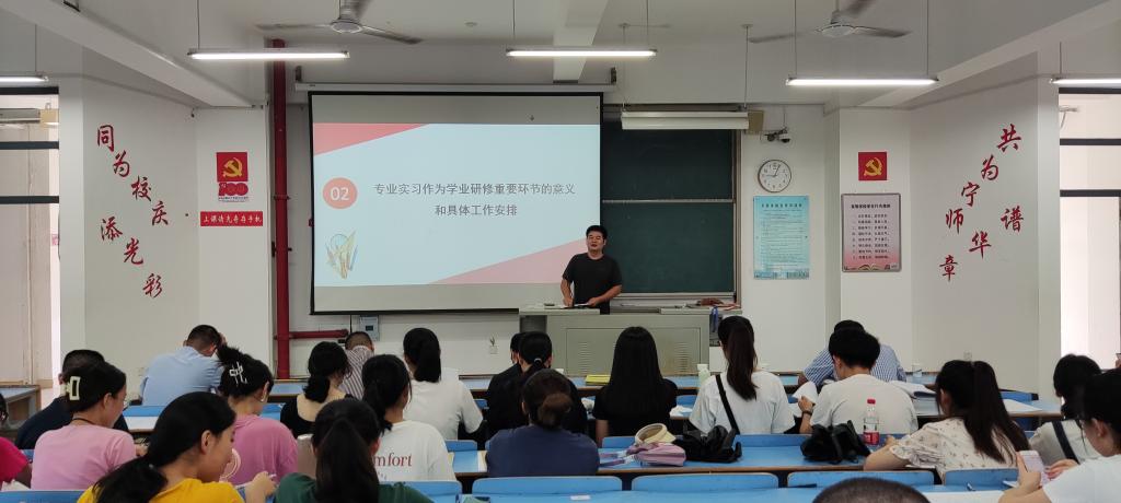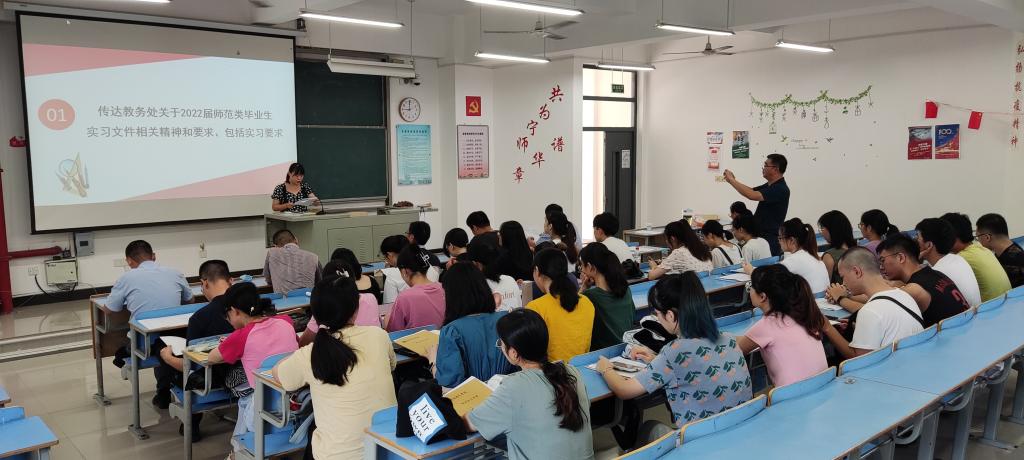 会上周银珠传达教务处关于2022届师范生教育实习文件相关精神和要求,并强调了教育实习的八点工作要求。随后林雄平就专业实习的意义和具体工作做出安排,指出同学们需充分利用专业实习阶段,了解学习班主任日常工作,掌握好教学时长等技巧。