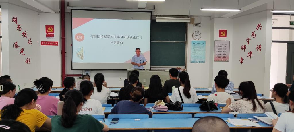 王楠楠指出,毕业生外出实习需严格遵守学校及实习单位要求的疫情防控工作注意事项做好疫情防控工作,并在实习阶段加强体质锻炼,充分利用实习期多渠道寻找就业机会。最后阮少江代表学院党政班子做总结发言,强调作为未来的生物教师要牢记16字核心素养,即:“践行师德,学会教学、学会育人,学会发展”。