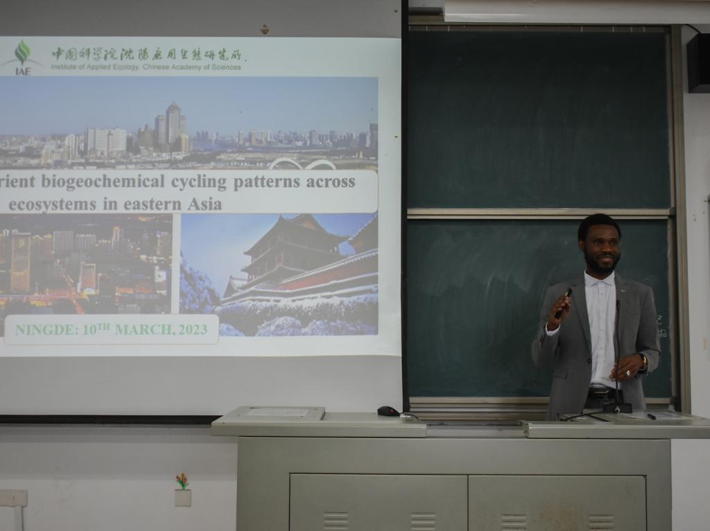 Abubakari Said Mgelwa开展对“东亚生态系统的长期营养生物地球化学循环模式”这一主题的演讲。他介绍了城市化导致的沿海氮污染和循环模式的改变、城市化对东南沿海河流的影响以及研究技术路线的讲解,最后表明N同位素的意义以及减少城市地区氮污染的管理方案等的结论和建议。