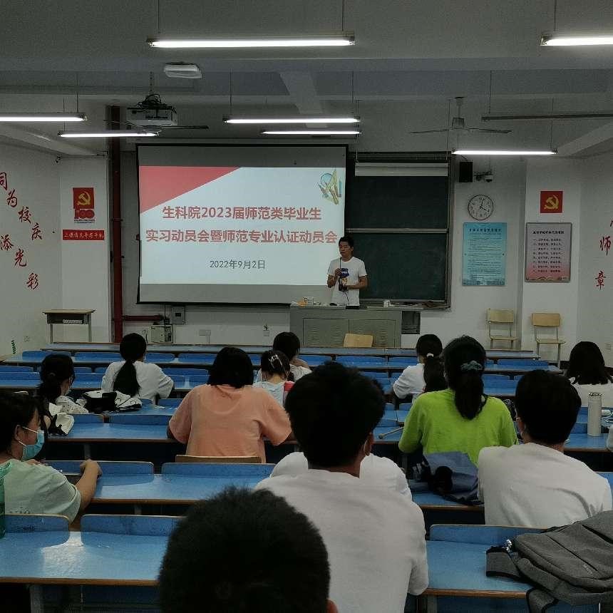 此次动员会旨在为即将到教师岗位实习的学生们解答实习文件、实习意义、具体工作安排、注意事项、实习要点等。会上周银珠首先传达校教务处关于2023届师范类毕业生实习文件相关精神和要求;随后林雄平讲解专业实习作为学业研修重要环节的意义以及对于师范类专业认证的重要意义,并就2023届生物科学专业实习具体工作做详细部署,并强调所有实习生需严格遵守双方学校的规章制度,转化理论知识,汲取实践技能。
