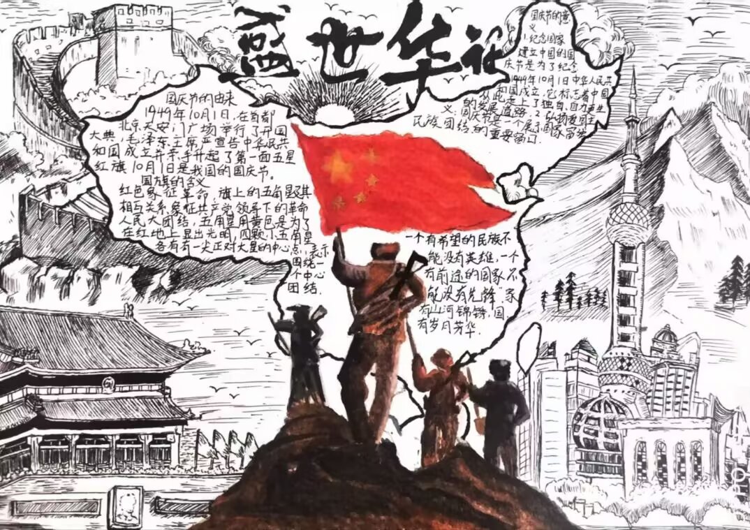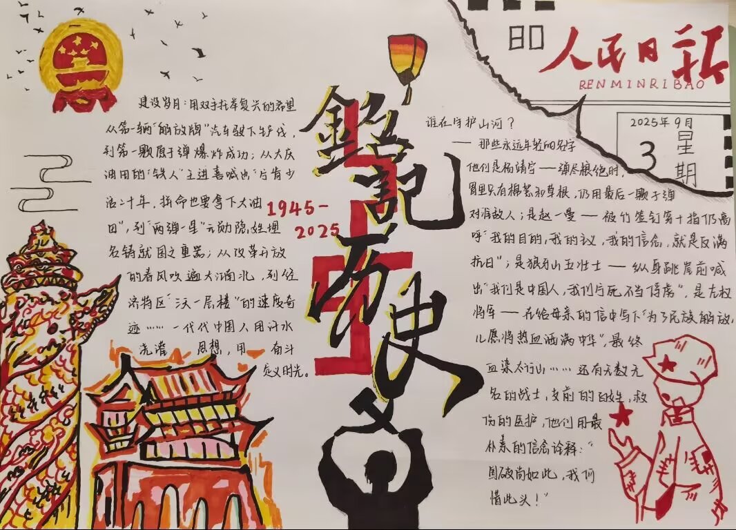 今年恰逢抗日战争胜利八十周年,为传承伟大抗战精神,将爱国教育融入实践,10月1日-8日,我校自然坊社团开展“少年心向祖国,画笔绘未来”线上主题手抄报活动,旨在引导学生在创作中深刻理解国家发展成就与核心价值,以笔墨丹青表达对祖国的热爱与祝福。