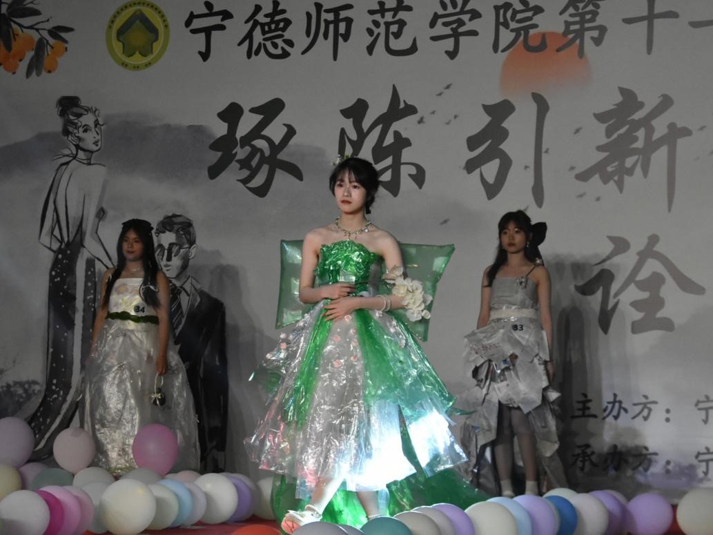 活动现场,54名模特身穿美奂绝伦的服饰配合娴熟的台步,充分体现出设计师们独特新颖的思路想法。其中26号选手的作品“春日宴”,通过粉玫瑰纸巾和打包膜的拼接配合着绚丽的舞姿让大家感受到了独属于春天的肆意浪漫。32号王发会、孙艳、刘文博同学带来的“绿艺生机”,传统编织工艺与当下流行元素棋盘格、蝴蝶结的呼应是此套绿白色时装的点睛之笔。林洪旭同学的“敦煌2077”,一出场就让全场气氛热火朝天,艳惊四座,完美诠释出“琢陈引新,诠绿予衿”的主题理念。比赛过程中穿插的茶艺、跆拳道等表演将氛围一次次推向高潮,为同学们呈现出一场蔚为壮观的视觉盛宴。