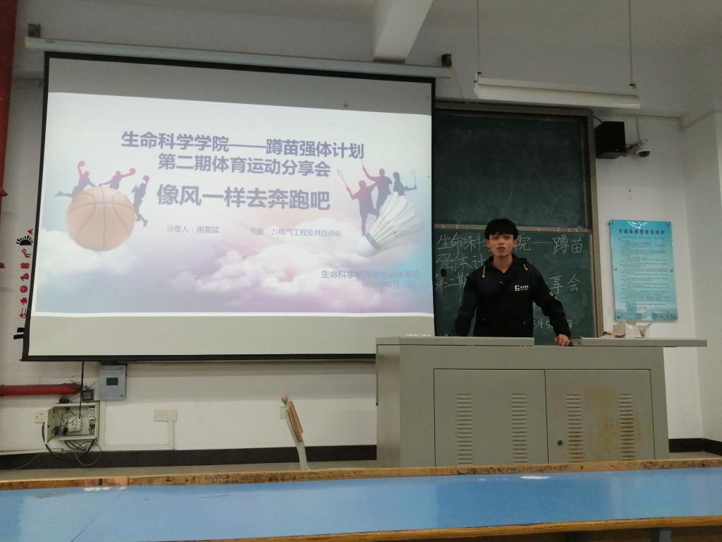 谢嘉猛从“欣赏跑姿”、“跑步的好处”、“跑步的姿势”“喜欢跑步的原因”四个方面展开了此次分享会。在欣赏跑姿方面,谢嘉猛为同学们详细介绍了保罗·切利莫的跑步姿势,并放出视频欣赏。之后,谢嘉猛以自身通过跑步减重的经历展开讲述了跑步的好处。在跑步姿势方面,谢嘉猛分享了以下几点建议,“上半身略微前倾”、“手贴在身体两侧,前不露肘,后不离手”、“身体核心要收紧”……“跑步是最简单、最廉价的运动”谢嘉猛提出,跑步是一种低成本高收益的运动,它的大众性与普适性是其他运动无法比拟的,这也是大众喜欢跑步的原因。