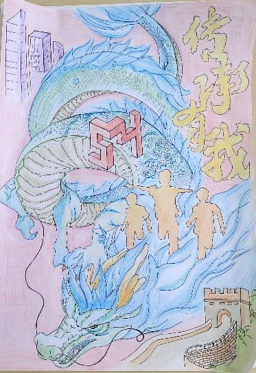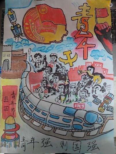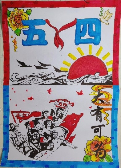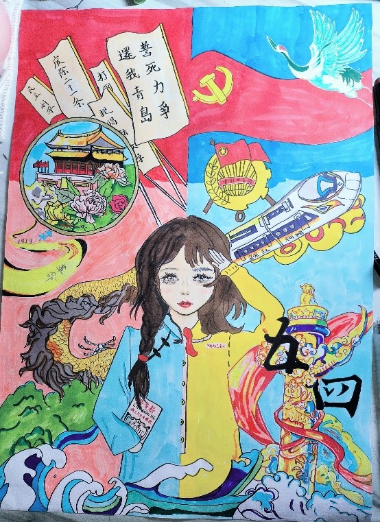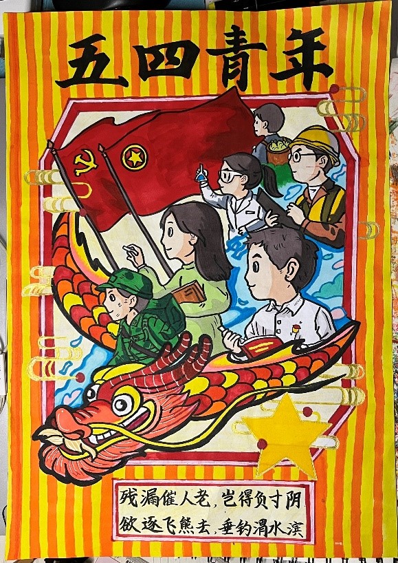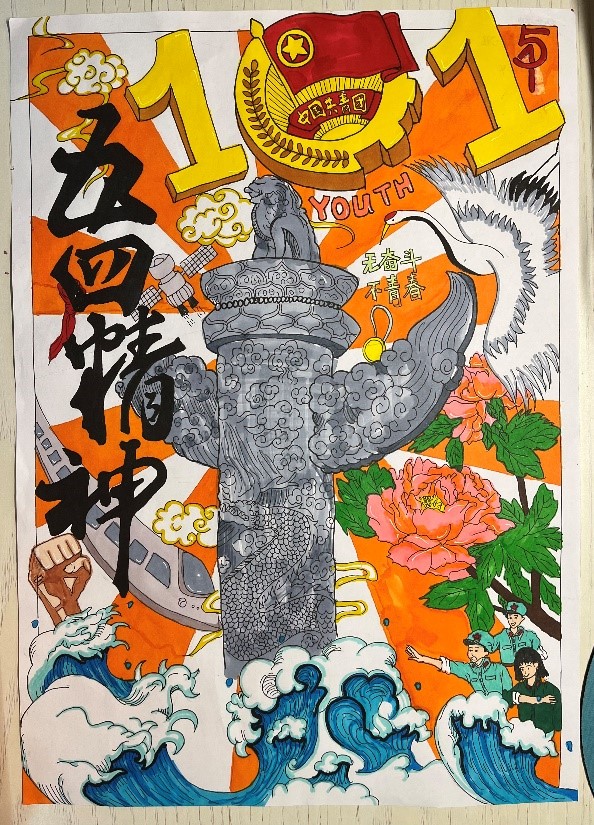 这次比赛我校一共75个选手参赛,其中林琬婕的《五四精魂不老,中国风华正茂》作品主要采用过去与今朝的对比,采用拼脸画法表达了学习与传承五四精神的决心。作品运用了较为大胆的色彩丰富主题,一条龙从中间穿过变成了高铁,强调创新与发展;李珊珊的作品以五四精神为主题,海报的上部由“共青团团徽”和“共青团成立101年”组合而成的101。海报中心主体为“华表柱”,象征中国青年蒸蒸日上。两旁由象征着和平与青年的素材聚集而成,均象征着中国青年是有远大理想抱负的青年;始终是实现中华民族伟大复兴的先锋力量。