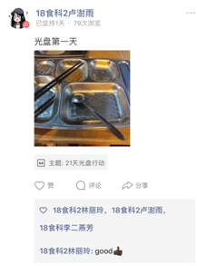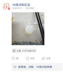 同学们通过QQ小打卡程序,打卡午餐或晚餐的光盘照片来践行光盘行动。本活动中,英国365集团师生纷纷发表了自己光盘的照片以及心得,积极宣传光盘事迹,弘扬节约风气。