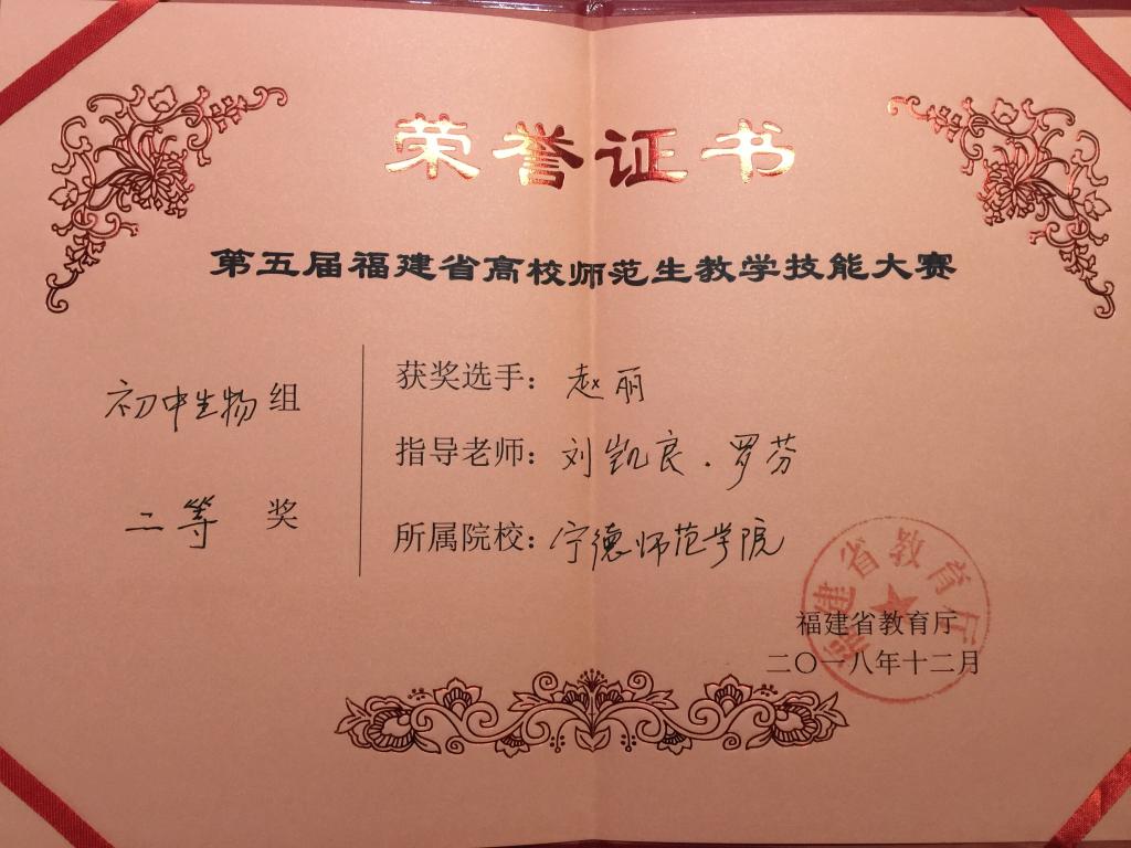 2018年12月22-23日第五届福建省高校师范生教学技能大赛在武夷学院举办,生科院2015级生物科学专业赵丽同学获得初中生物组二等奖。