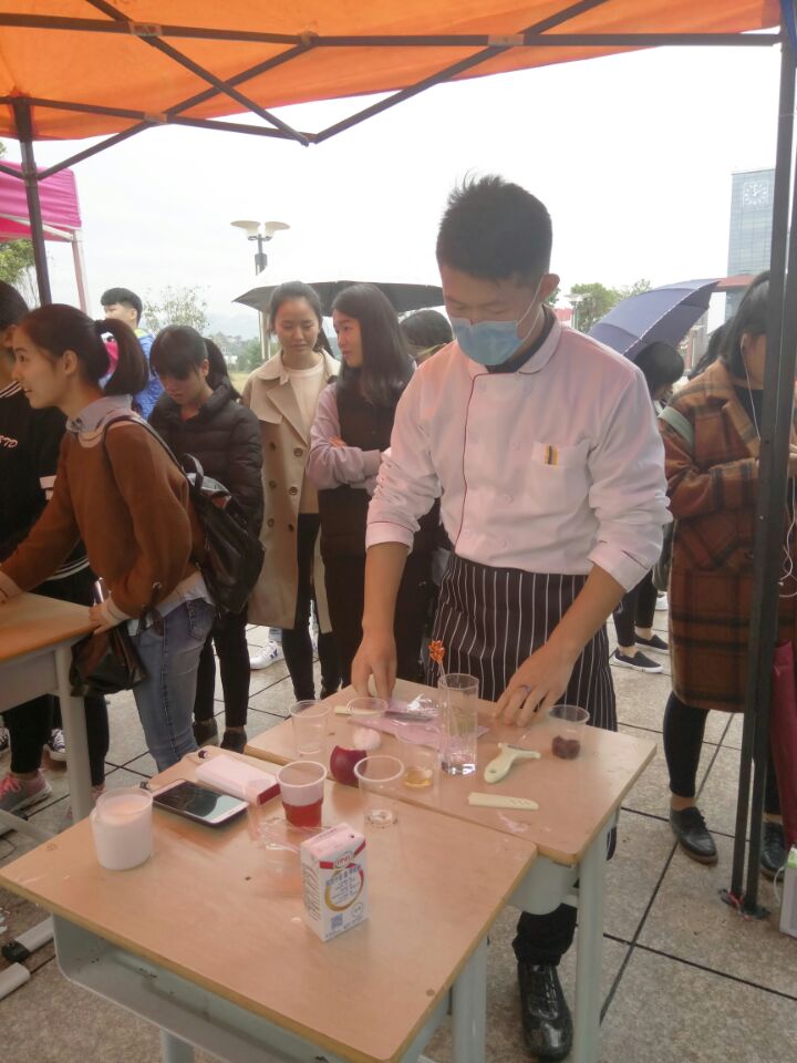 此次茶产品创新设计大赛活动的内容包括奶茶和茶点制作两项。在比赛现场,同学们全身心地投入制作,之后将成品向评委进行解说,比赛有序进行。