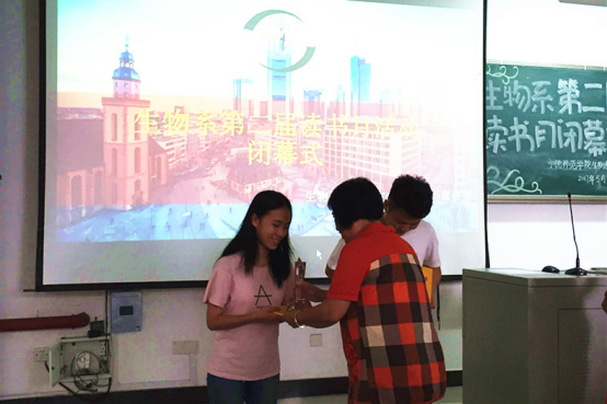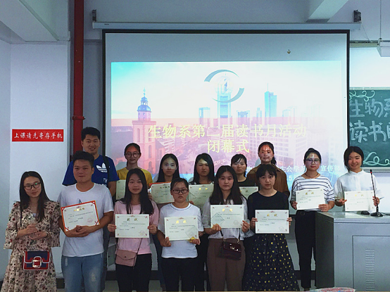 5月23日下午,生物系第二届读书月闭幕式于求实楼CC201举行。出席闭幕式的有系党总支书记陈爱平、系团委负责老师王永吉、14、16级辅导员林宏宇,主持人由16级学生林淑娟担任。