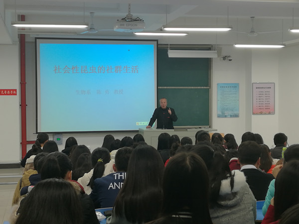 12月16日晚,陈勇教授在求实楼cc201为我系学生开设题为《社会性昆虫的社群生活》的专题讲座。