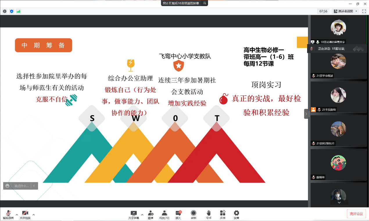 其次,中期筹备方面,她有选择性地参加与师范生有关的活动,并担任了综合办公室助理积极参加暑假社会支教活动和顶岗实习,她鼓励大家应积极参与实践。