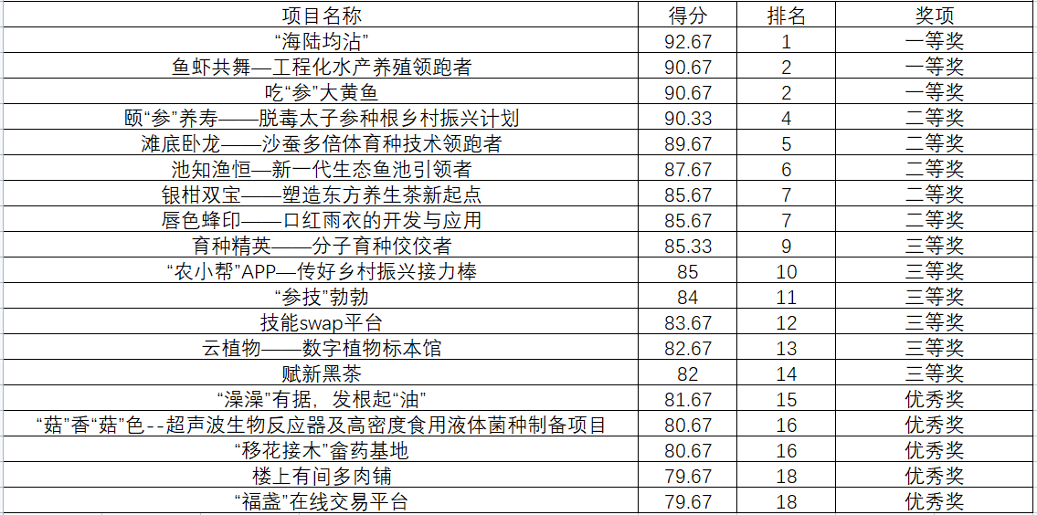 本次大赛共19个参赛团队。每个团队的答辩选手结合美观的PPT,以娓娓道来的解说对评委老师及观众进行了现场演示。演示答辩过程中,团队展示了项目进展、优异的研究成果,阐述了对项目的未来展望。其中几个项目尤为新颖,比如“海陆均沾”和“鱼虾共舞——工程化水产养殖领跑者”。其中,“海陆均沾”团队希望通过他们的技术,可以让全国各地的人都能采购到新鲜美味的活体大黄鱼;而“鱼虾共舞——工程化水产养殖领跑者”团队采用鱼虾共舞养殖模式,使其收益效果更加显著。在每个团队答辩过后,评委老师都提出了许多良好的建议。经评委老师商议后,“海陆均沾”等3个团队获得了一等奖,“颐‘参’养寿——脱毒太子参种根乡村振兴计划”等5个团队获得了二等奖,“育种精英——分子育种佼佼者”等6个团队获得了三等奖,“‘藻藻’有据,起根发‘油’”等5个团队获得了优秀奖。