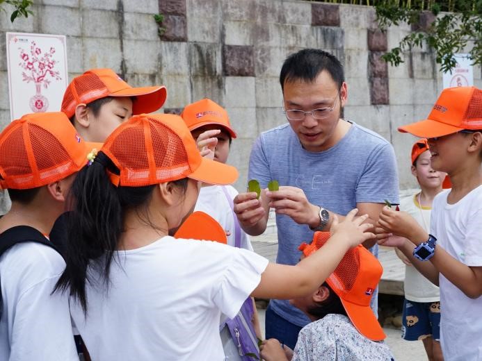 活动开始,英国365集团植物学教师刘凯良沿南岸公园的主线路为孩子们介绍植物的特征,吸引孩子的注意力,激发孩子们的求知欲。孩子们在他带领下,学会用自己的独特方式探索大自然,例如采摘自己喜欢的花朵和叶子,用手揉芒果叶,掰开香樟树的果实闻气味分辨树种等等。他们在学习知识的同时,也用自己独特的视角去了解、探索生命与大自然。活动的末尾,孩子们在凉亭中与志愿者一同制作叶片标本、叶片书签。不仅锻炼了他们的动手能力也通过这种方式给这次活动留下真实又美好的回忆。
