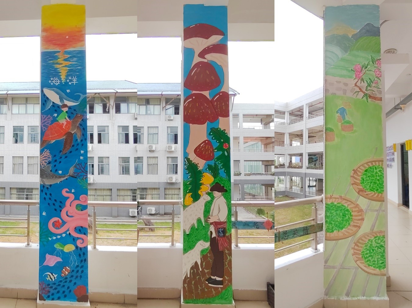 活动在同学们的积极参与下,征集到了一幅幅优秀作品,展示着同学们的才华和青春风采。经过评比,选出了三幅获奖作品作为学院C区大厅门柱墙绘画。在一众优秀作品中,《先苦后甜》绘出了一种生活态度,一种乐观向上、吃苦是福的人生哲学;《海洋》绘出了人与自然和谐共生的画面;以及《生之“蘑”力》绘出了蘑菇的亭亭玉立,灵性鲜活。随后同学们把纸上画搬至墙面上,在墙上留下了茶的苦中有甜、海洋的包容万物和菌菇的生机盎然,展现出自然气息与活力,更体现宁德丰富的生物自然资源。