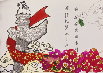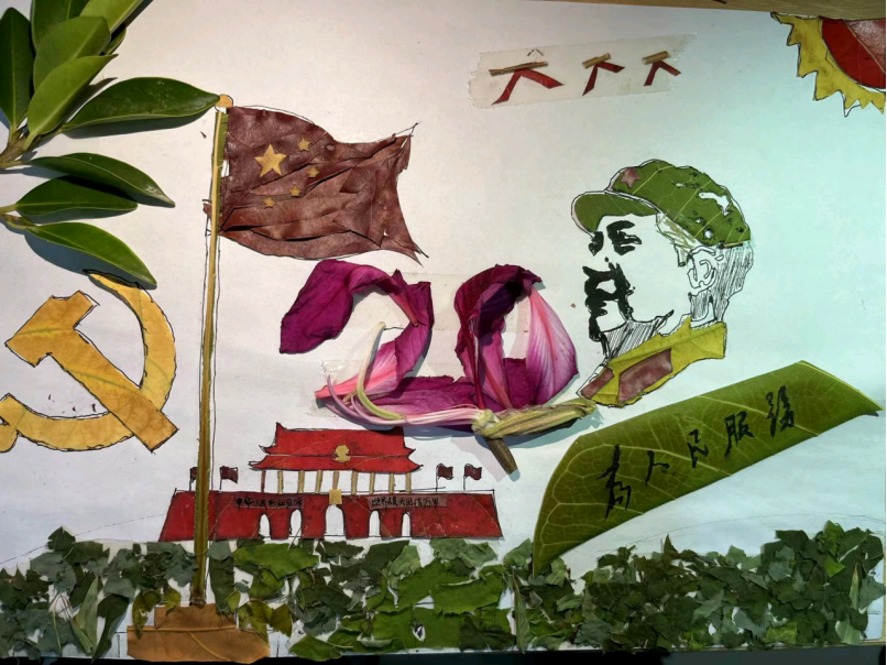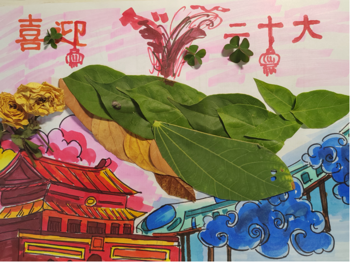 同学们以叶为笔绘出一幅幅作品,展现出丰富的想象力。其中参赛作品《旭日的希望》以56个叶子碎片组成草地、向上扬起的红旗以及一轮红阳,绘出了中国人民紧密的团结、中国似锦的前程、光明的未来以及蒸蒸日上的共产党;《红船颂》以红船为主要元素,辅以四季自然草木做装饰,寓意红船精神在经历无数个春夏秋冬,终将扬帆起航,斩浪劈波。《如鲸向海》以叶片作为元素制成鲸,代表勇往直前的伟大志向,进而表达了对美好未来的肯定和期待。