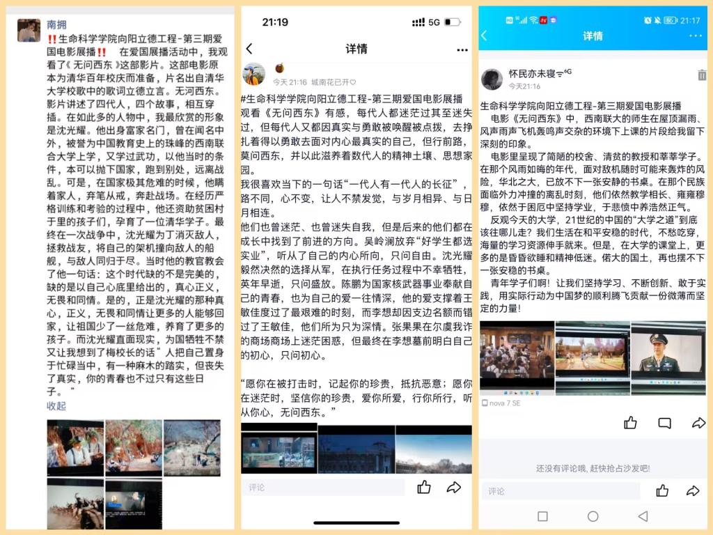 电影结束后中,同学们纷纷发表了对于此部爱国电影的感悟。例如2022级食科(2)班的林诗莹同学说:“《无问西东》这部影片通过四代人在不同的时代、不同的社会环境、不同事物干扰和阻碍下,面对纷扰复杂的选择他们仍然坚持自己的初心。所以无论外界的社会如何跌宕起伏,我们都应该对自己真诚,坚守善德之心。无问西东,用四个故事告诉我们勇往直前。”以及2022级食科(2)班的黄亚芳同学说:“电影展示了对生命的叩问,以及对人性的思考,展现了可怕的团体暴力,真诚的个人,被恐惧和虚荣支配的后悔与最终的牺牲等。很喜欢沈光耀和他妈妈的那段戏:‘你所能到的名利光荣,祖上早就有了。那只是人生的一丝幻光而已’。也很喜欢里面的年代感,很喜欢那条长长的银杏树路。那么金黄那么温暖。”