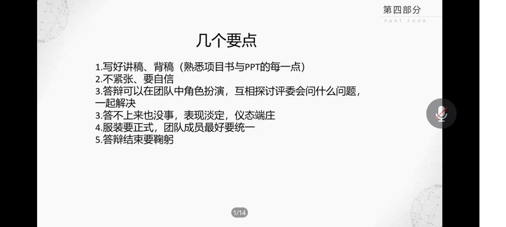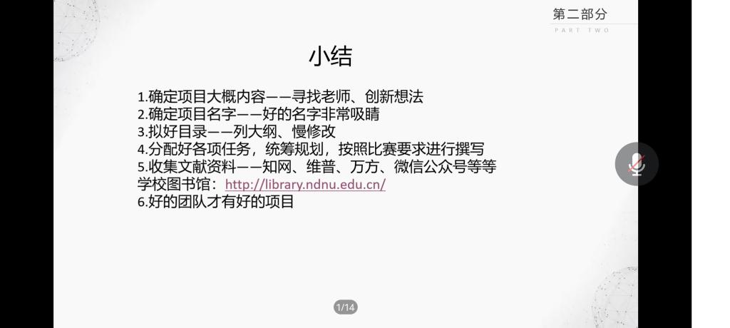 陈思仪结合自身专业学习,从“资料收集”、“制作项目书”、“制作ppt”和“路演答辩”四个部分进行分享。第一部分内容以“‘互联网+’大学生创新创业大赛”为例,详细讲解了高教主赛道创意组项目评审要点中的创新性,告诉同学们要寻求突破和创新。随后陈思仪对制作项目书进行小结,告知同学们路演答辩时不要紧张。对于比赛的收获,陈思仪以提问的形式与同学们积极互动,引导同学们树立创新意识,培养创造能力,锻造创业精神。