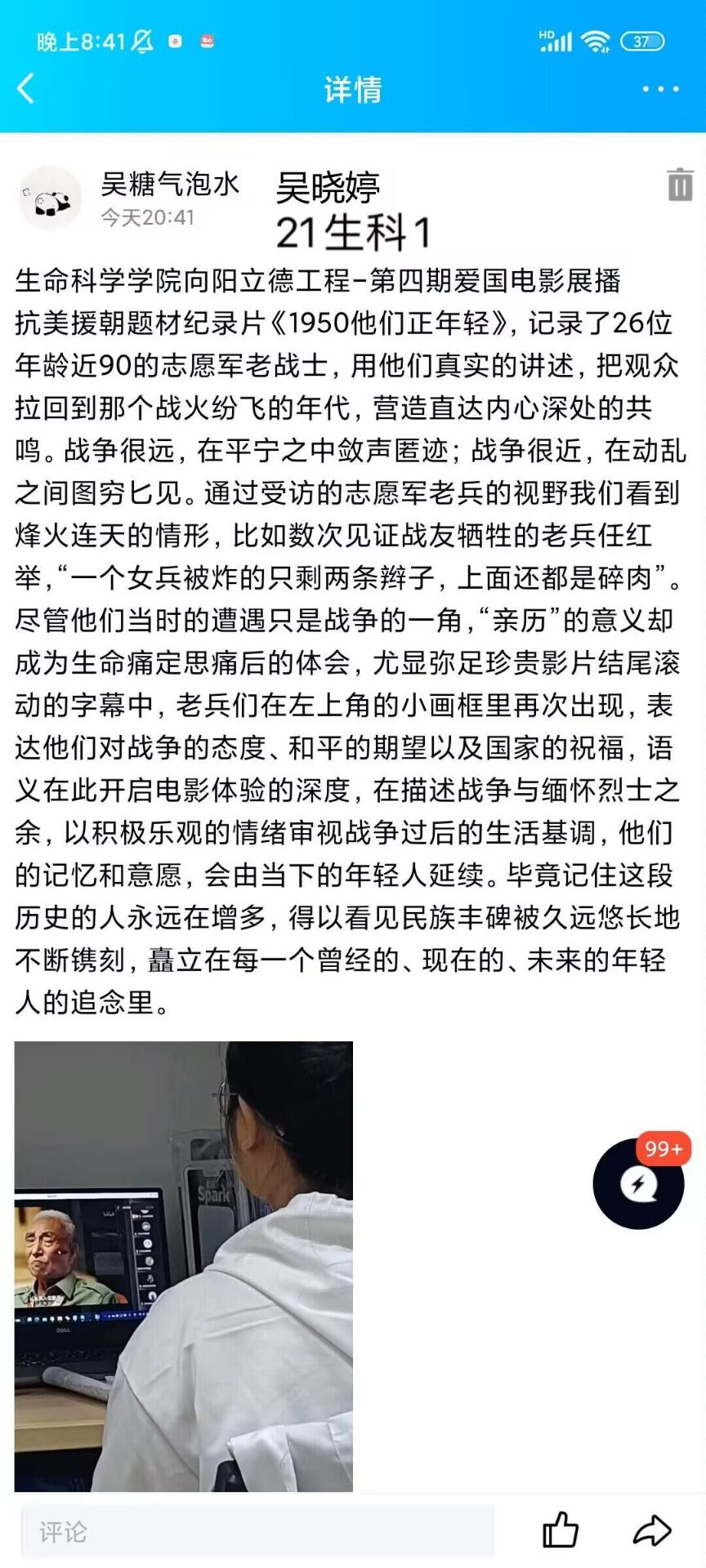 观影结束后,同学们纷纷发表了自己的观后感。其中, 2021级生物科学(1)班吴晓婷同学说:“记住这段历史的人永远在增多,得以看见民族丰碑被久远悠长地不断镌刻,矗立在每一个曾经的、现在的、未来的年轻人的追念里。” 2020级生物技术(1)班陈炜晴同学说:“1950年的他们,正是风华正茂之时,他们如同在黑暗中怀揣着一颗向日葵种子的前行人,他们不知道什么时候天会亮起来,但是他们相信天就快亮了,他们中的许多人倒在了黎明前,他们怀里的向日葵从他们倒下的躯体迸发而出,迎着新生的太阳微笑,那株向日葵就是今日之富强和平中国。正是因为他们相信未来,所以我们才有现在。向为伟大的抗美援朝战争这一立国之战奉献自己一切乃至生命的先烈和老兵们致以最崇高的敬意!”