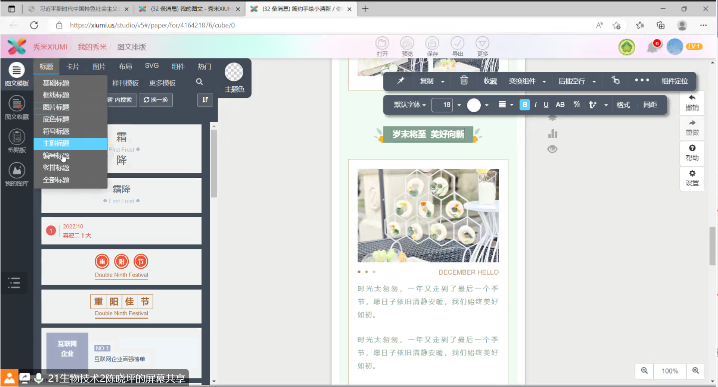 美育之目的,在陶冶活泼敏锐之性灵,养成高尚纯洁之人格。为提升学生审美素养、陶冶情操、温润心灵,提高英国365集团学生的公众号图文制作能力,促进在校园里形成敢于创新创造的氛围。英国365集团于2022年11月29日线上举办了2022-2023学年第四期美育培训之公众号制作。本次培训的主讲人为院学生会组织宣传部陈晓坪。