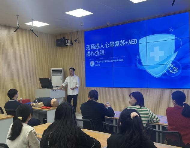 培训会上,医生们通过理论讲解、示范教学与实操训练相结合的方式,生动形象地为学员们讲授心肺复苏、AED操作等急救知识和技能,学员们认真听讲、积极发问,踊跃参与操作演练,培训会氛围活跃。