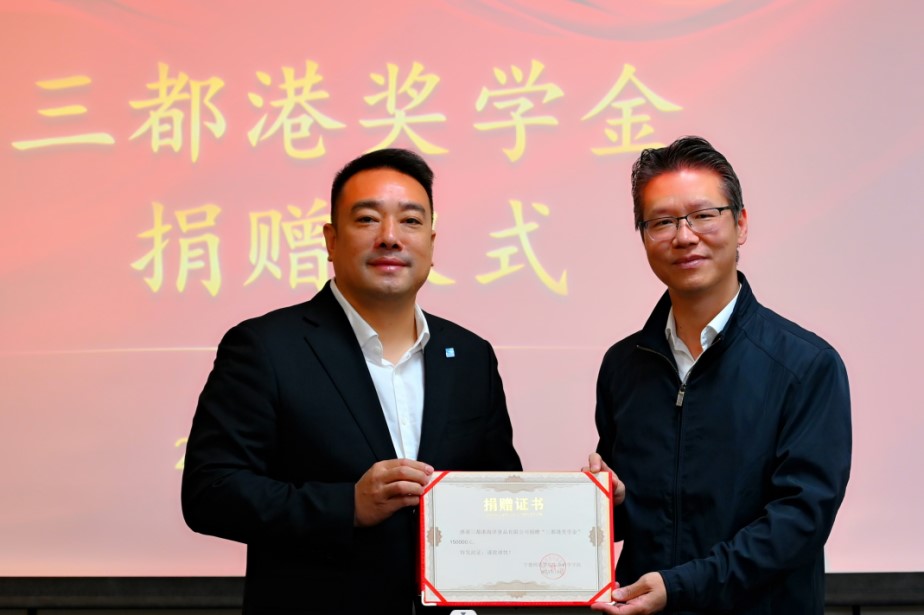 捐赠仪式上,江潮炳代表学校接受捐赠,为三都港海洋食品有限公司总经理尤信铃颁发捐赠证书。并致答谢词,他表示,三都港食品有限公司的捐资助学,体现了地方企业对地方教育事业的深厚情怀和社会责任担当。希望校企双方能以本次捐赠为契机,进一步深化双方在人才培养、教学科研、实习实践、就业等方面的交流合作。