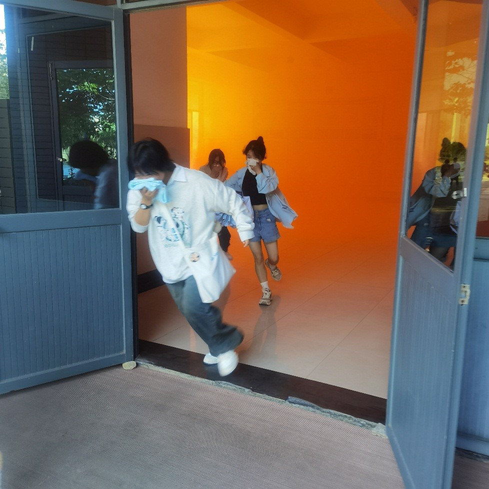 随着警报铃声拉响,生物实验楼内烟雾四起,消防演练拉开序幕,在老师们有序的组织下,学生们都用湿毛巾捂住鼻子和嘴巴,小步弯腰快走,向操场疏散,全体师生在较短的时间内,安全、有序、镇定、快速地到达疏散集合地(生物实验楼前操场)。在整个疏散过程中做到了师生配合默契、疏散路线清楚、组织有条不紊、人人各尽其责。消防应急演练取得圆满成功。