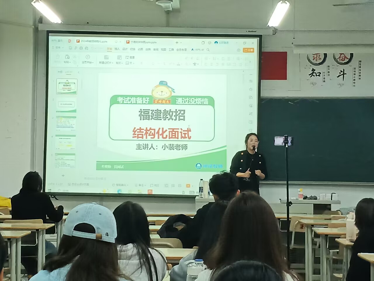 本次讲座特邀小裴老师担任主讲,内容紧扣教招面试核心要点。小裴老师全面讲解了面试流程,从仪态仪表到答题思路,无一不细致入微。通过生动案例与互动练习,她深入剖析了语言表达、肢体语言、情绪管理在面试中的重要性,并传授实用训练技巧。