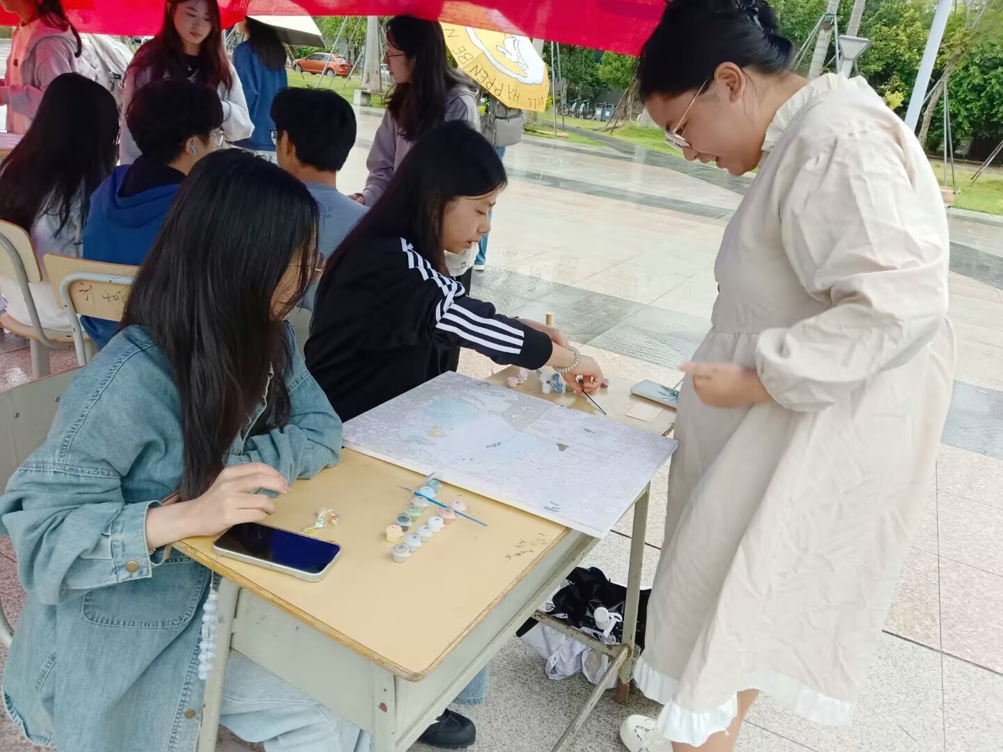 本次活动的主题是“秋色斑斓,欢乐共享”。活动以集章打卡的形式展开:参与者凭提前填写的收集表领取集章券,通过“校园晒秋”“非遗扎染”“拼接诗歌”“颜料画画”四个趣味环节即可集章抽奖。在“校园晒秋”区,同学们用丙烯马克笔在落叶上书写秋意诗句与祝福,将叶片拼贴成诗意“晒秋图”;“非遗扎染”环节中,工作人员讲解扎染技法后,同学们用皮筋、绳子创意扎结方巾,经蓝色染缸浸染,解锁了独属于自己的蓝白纹样;“拼接诗歌”区里,大家从文字胶带上选取词语,自由组合成灵动的三行短诗;“颜料画画”环节则以集体填色的方式,让同学们在协作中完成了一幅色彩斑斓的画布作品。